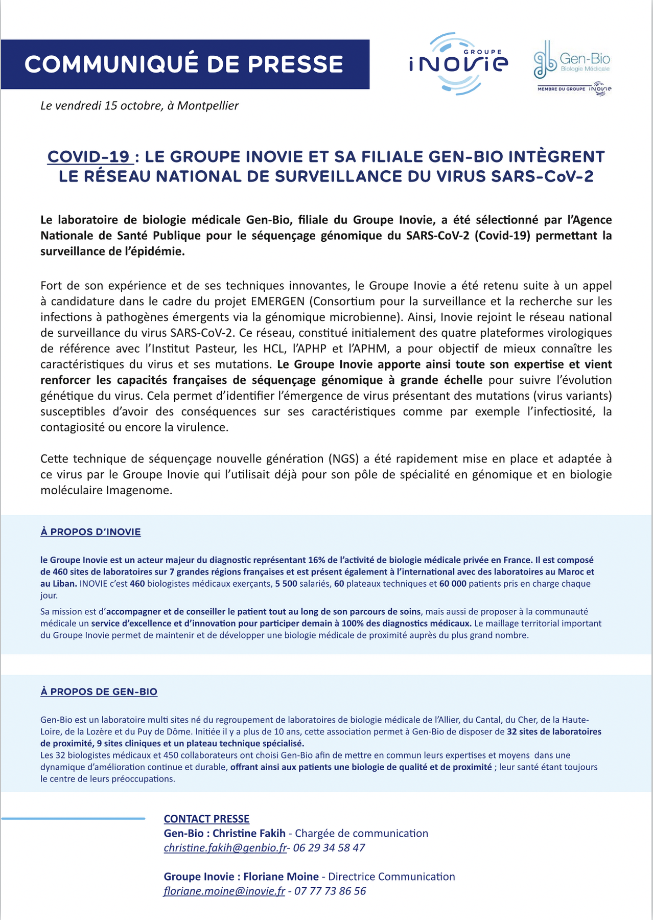 Le Groupe INOVIE et sa filiale Gen-Bio intègrent le réseau national de surveillance du SARS-CoV-2